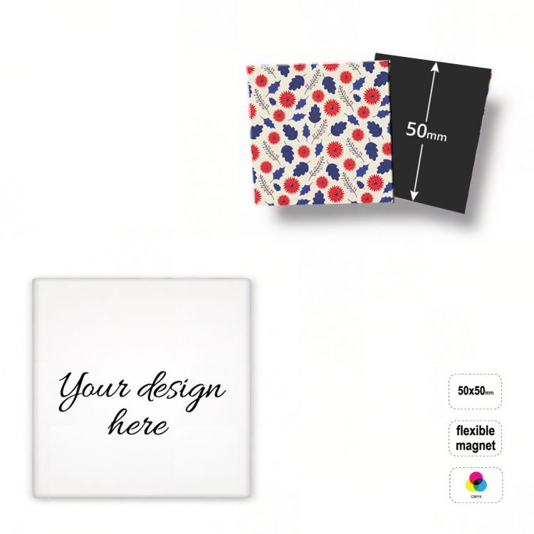 Imán cuadrado, flexible, de lámina magnética acoplada a una superficie de papel plastificado. El producto es totalmente personalizable en el anverso con impresión digital.