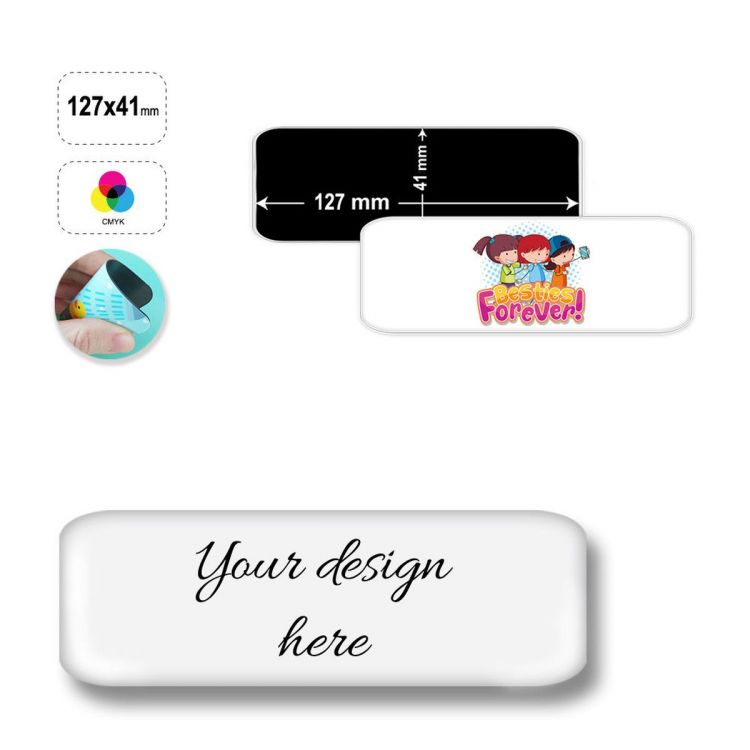 Imán rectangular, flexible, fabricado con una hoja magnética laminada sobre una superficie de papel plastificado. El producto es totalmente personalizable en el anverso con impresión digital.