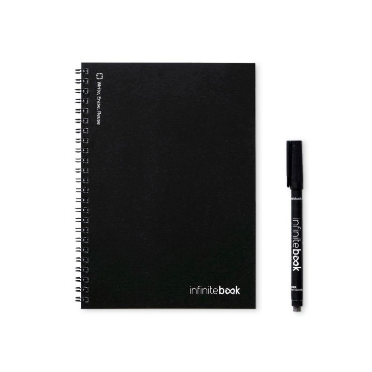 Libreta A5 - "Infinitebook" - con tapa flexible y anillas de color a juego. Contiene 15 páginas lisas estilo pizarra blanca y un rotulador negro. Este bloc de notas permite escribir y borrar fácilmente, y es una solución práctica para minimizar el consumo de papel. Las notas se pueden escanear. Fabricado en Europa. Se entrega en un sobre de papel kraft con una pegatina. 148 x 210 mm. Producto en color negro