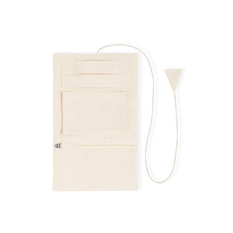 Joyero plegable fabricado en algodón, para guardar preciados artículos personales. Confeccionado en 3 partes de color natural: parte superior con cintas, parte central con bolsillo y parte inferior con bolsillo de cremallera, pudiendo plegarlo y sujetarlo firmemente con su cordón a juego. (color natural)