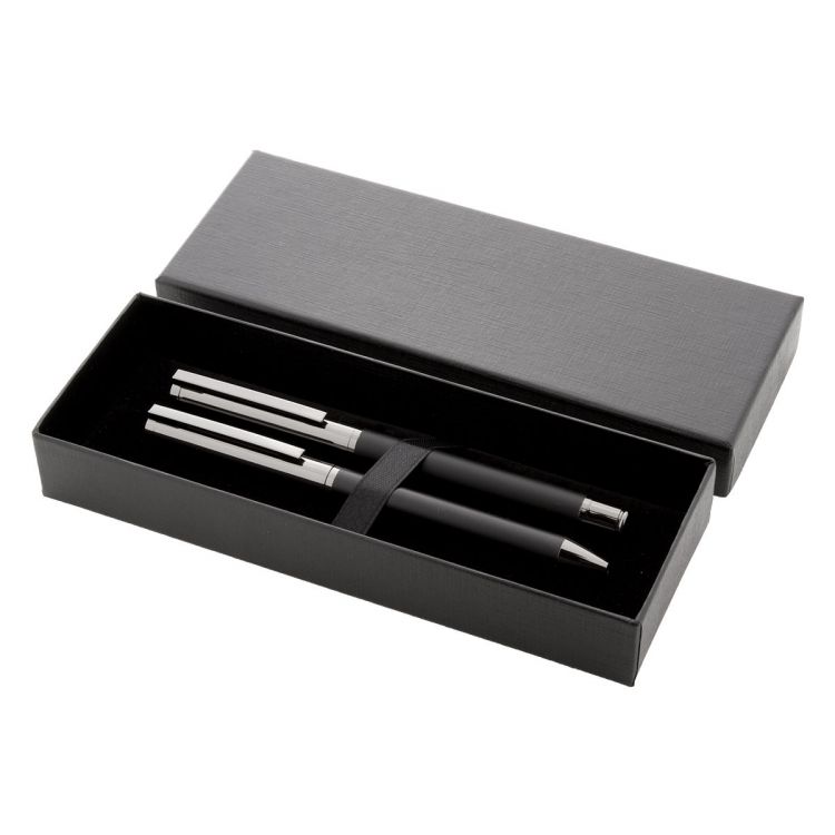 Elegante juego de bolígrafo metálico con bolígrafo y roller en estuche de regalo de papel negro. Con recambio azul.
