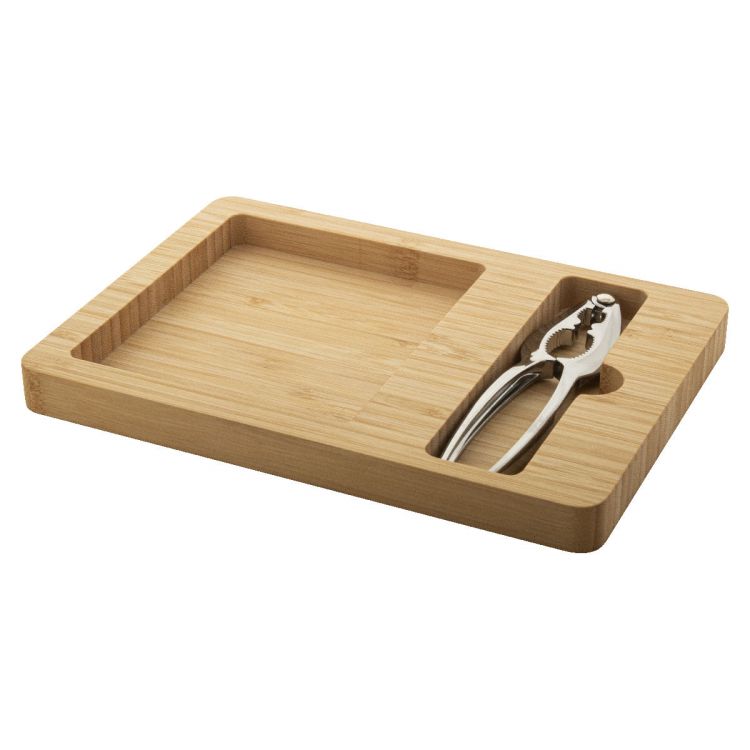 Juego de cascanueces con bandeja de bambú y cascanueces de metal. En caja de papel kraft