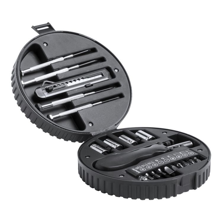 Juego de herramientas de 20 piezas en maletín de plástico con forma de rueda de coche