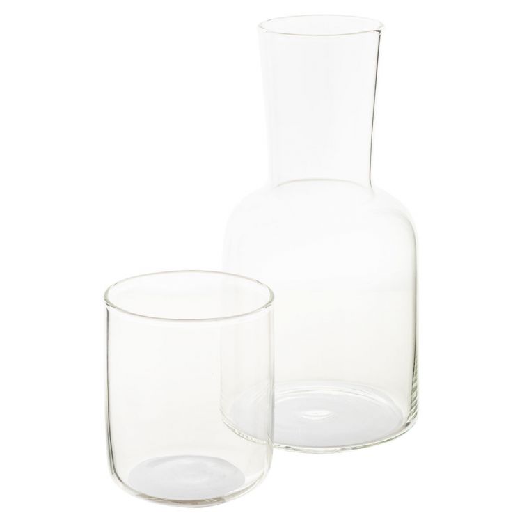 Juego de jarra de agua de vidrio borosilicato (800 ml) y vaso (300 ml). En caja de papel kraft. Apta tanto para bebidas frías como calientes, también puede utilizarse como botella decantadora, de color blanco transparente