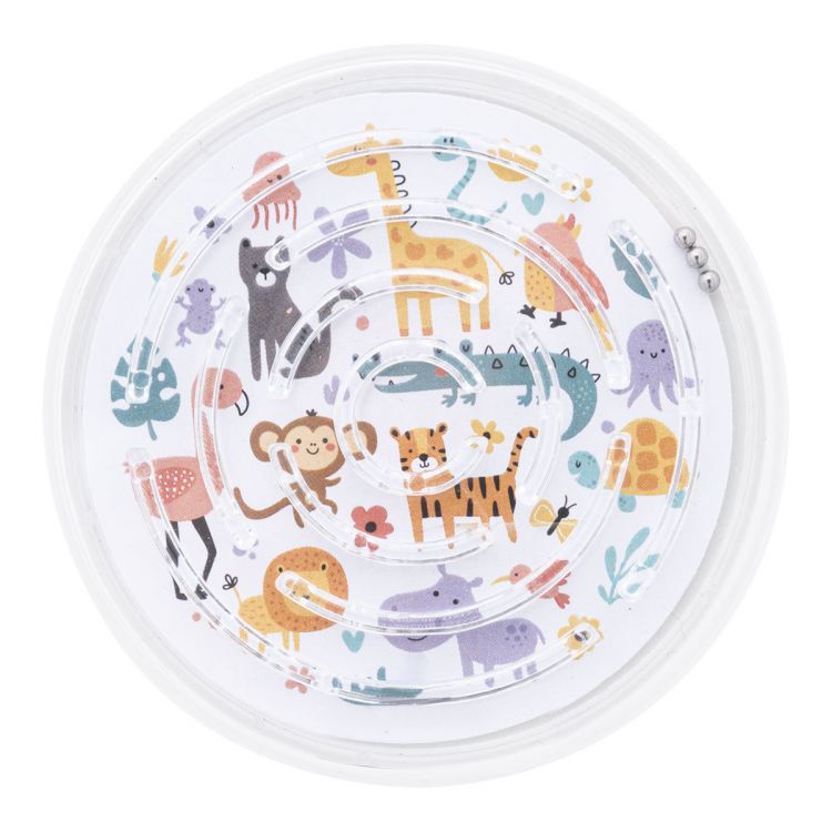 Juego de laberinto redondo de PS reciclado con tres bolas de metal. Con inserto de papel a todo color personalizado. El precio incluye la impresión digital a doble cara. Cantidad mínima: 100 unidades