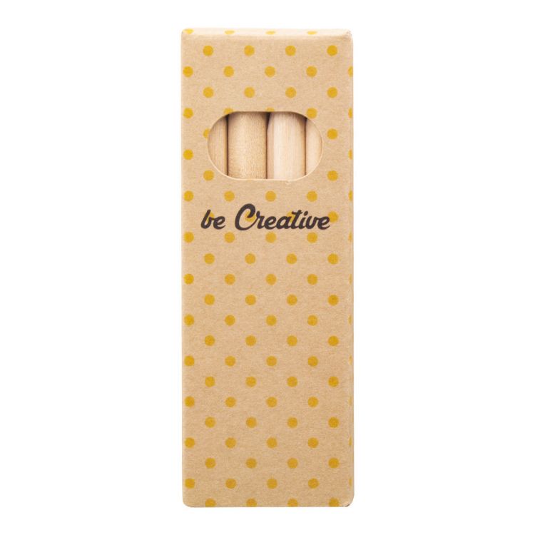 Lápices de colores de madera (4 unidades) en caja de papel kraft impresa a todo color. El precio incluye la impresión digital. Cantidad mínima: 100 unidades