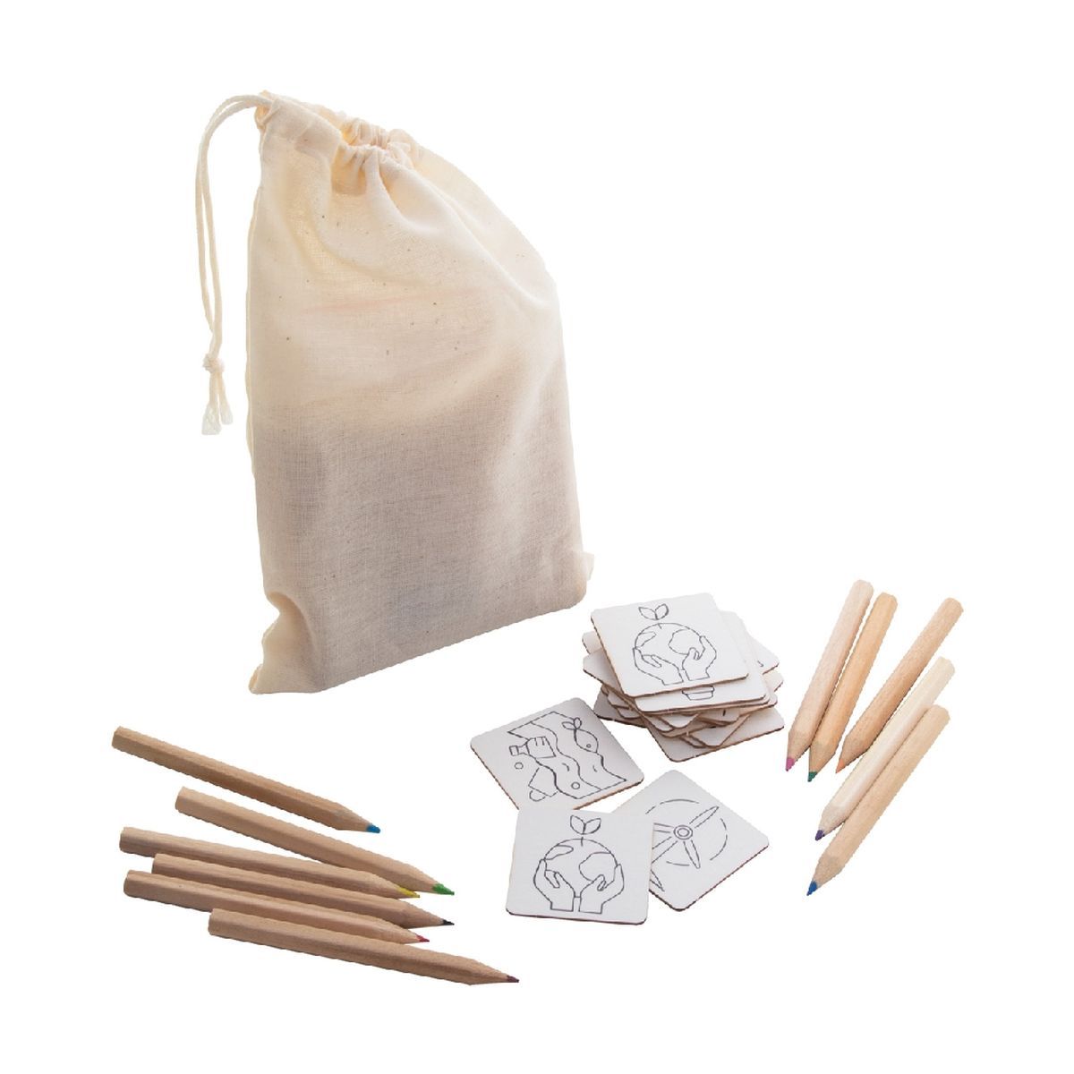 Juego de memoria para colorear en bolsa de algodón. Incluye juego de memoria temático de cartón (24 fichas) y lápices de colores de madera (12 unidades) en caja de papel