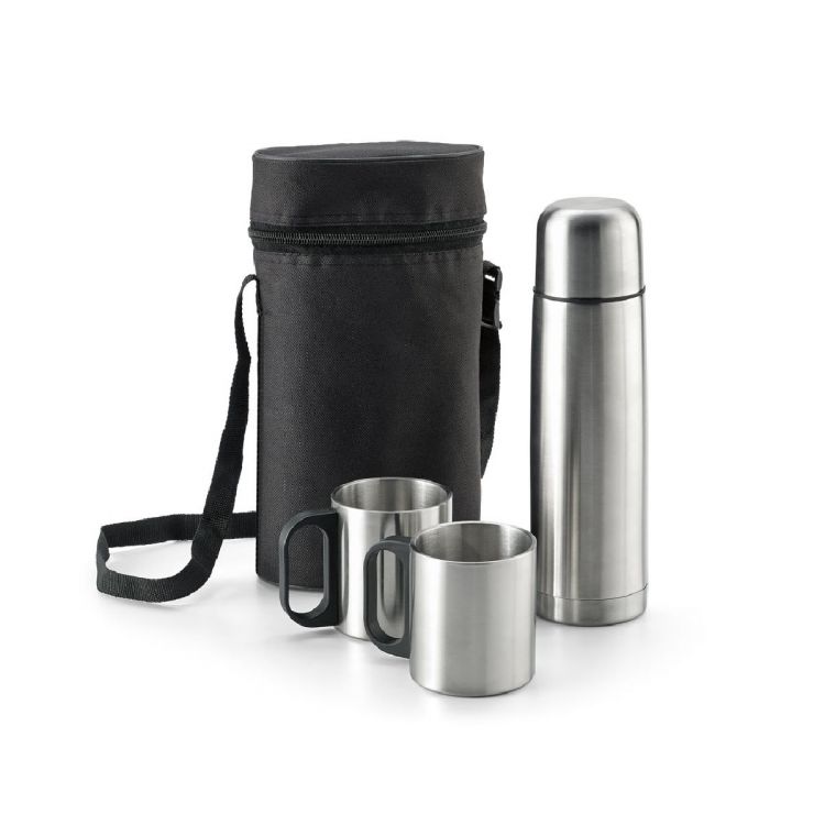 Set compuesto por 1 termo y 2 tazas en acero inoxidable. Las tazas disponen de una capacidad de hasta 200ml y el termo con doble pared, tiene capacidad de hasta 500 mL. Se suministra en una funda de poliéster 600D con asa ajustable. Funda: 155 x 250 x 90 mm. Producto en color plata