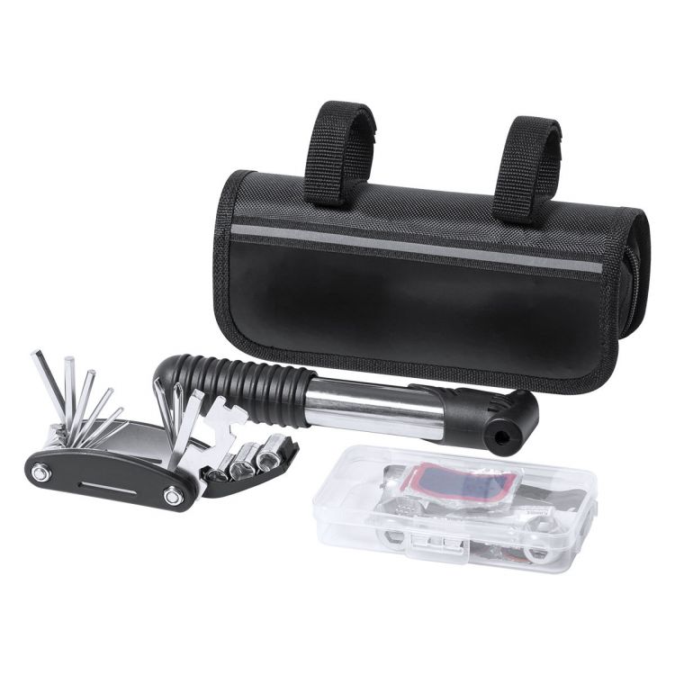 Kit de reparación de bicicletas en práctica bolsa para cuadro de bicicleta. Incluye: Multiherramienta de 15 funciones, llave hexagonal, minibomba y kit de reparación de pinchazos (2 palancas de neumáticos, rallador y 6 parches). Poliéster 600D, de color negro