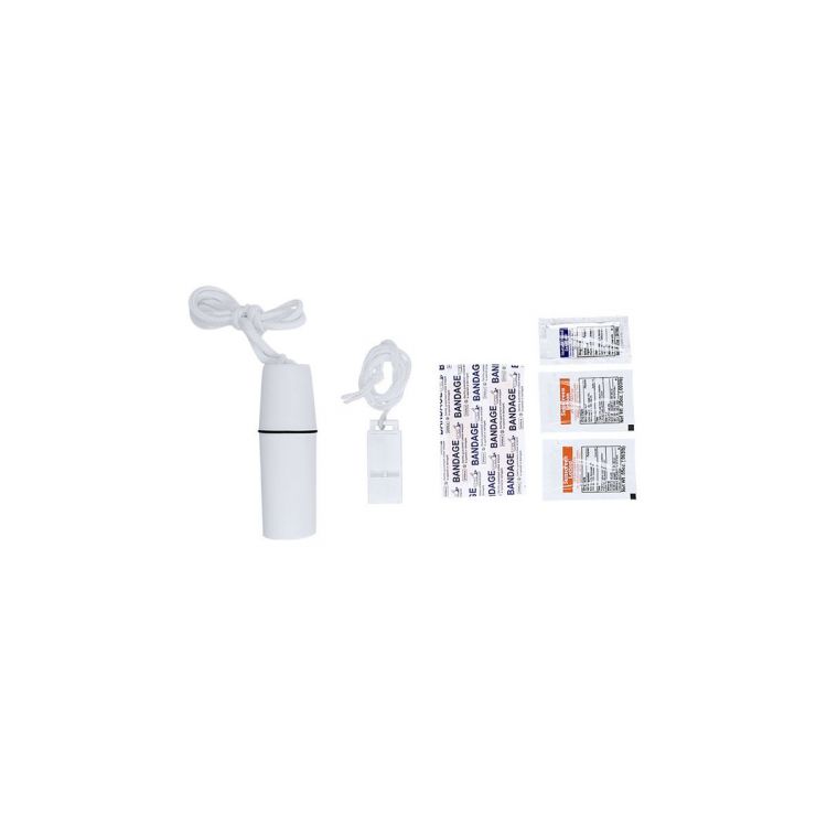 Kit de excursión de 6 accesorios presentado en un estuche en resistente ABS con cierre a rosca resistente al agua, con práctico cordón lanyard. Incluye gel hidroalcohólico, protección solar SPF30, vendas y 1 silbato. (color blanco)