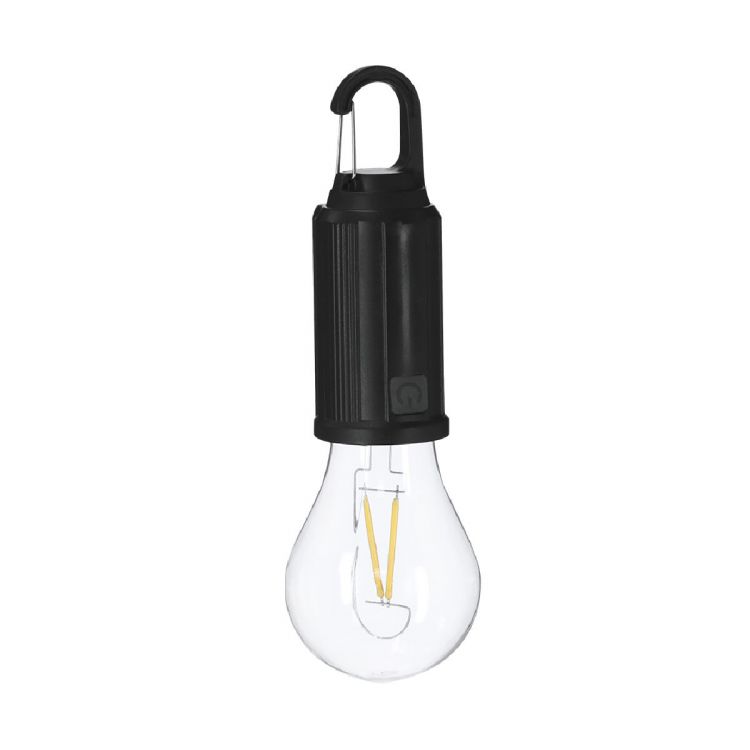 Lampara con original diseño de bombilla con cuerpo en ABS. Batería de 300 mAh y carga solar. Dispone de sensor nocturno que se activa automáticamente al no recibir luz solar. Dispone de carga a través de cable Tipo C, además de incluir mosquetón para fácil transporte. (color negro)