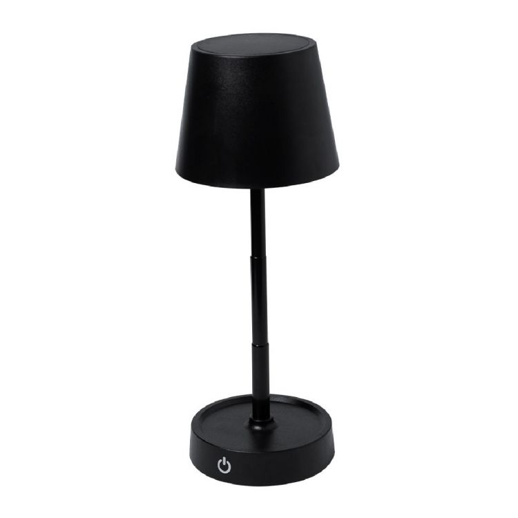 Lámpara de diseño en acabado negro mate. Incluye sistema de regulación de intensidad de luz táctil y con cuerpo plegable para ajustarlo en altura. Equipada con batería de 800mAh recargable por USB Tipo C -cable incluido- y 12 LEDs de luz cálida. Con botón encendido/apagado en la parte trasera. (color negro)