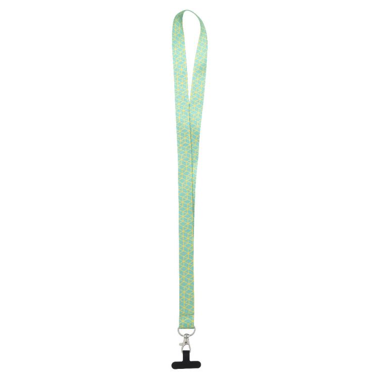 Lanyard para móvil RPET hecho a medida con mosquetón metálico y funda para el teléfono en papel resistente al desgarro. Con gráficos impresos por sublimación en ambos lados. Cantidad mínima de pedido: 100 unidades.