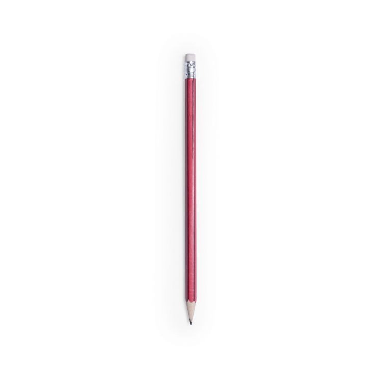 Lápiz de madera de acabado brillo. Cuerpo hexagonal y diseño bicolor, con goma de borrar en color blanco. Disponible en variada gama de colores, con mina negra y punta afilada.