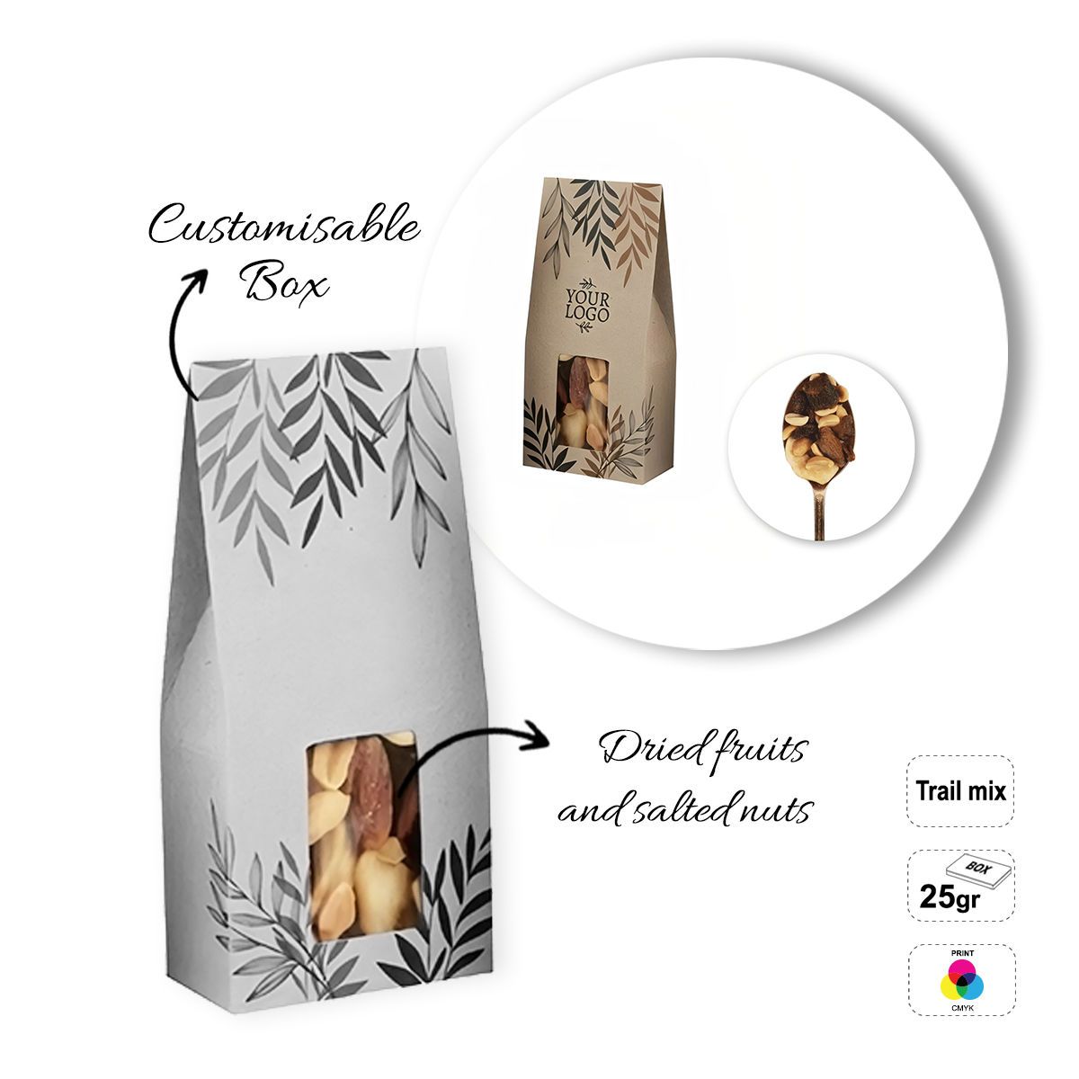 Paquete de frutos secos. Las letras del código del producto corresponden al tipo de snack: A- semillas de calabaza tostadas y saladas (7 g), B- mix de frutos secos y cacahuetes salados (7 g), C- almendras tostadas y saladas (7 g). Embalaje: caja de papel con ventana transparente en la parte frontal, totalmente personalizable (acabado del papel: blanco, kraft o crudo con fibras de hierba añadidas, a elegir en el momento del pedido). Vida útil mínima: 6 meses.
