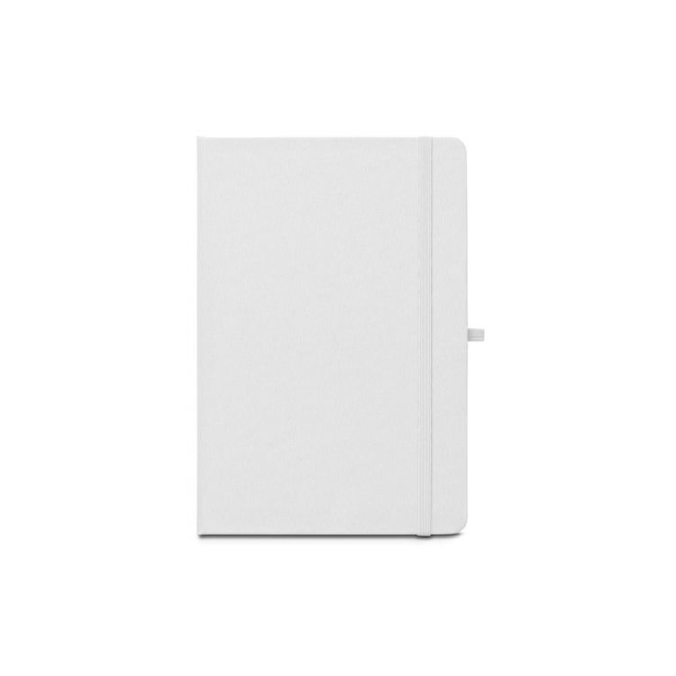Libreta A5 con tapa dura, ideal para personalizar por sublimación. Fabricada en poliéster reciclado (100 % rPET) 300D, cuenta con 160 páginas rayadas en papel marfil 100 % reciclado (70 g/m²), una tira separadora, un portabolígrafo (no incluido) y un cierre elástico. 143 x 211 mm. Producto en color blanco