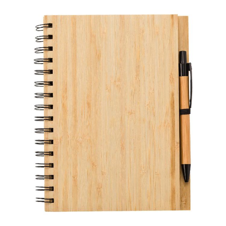 Libreta de bambú A5 con 80 hojas lineadas y bolígrafo de bambú con pulsador y punta de ABS. De tinta azul.