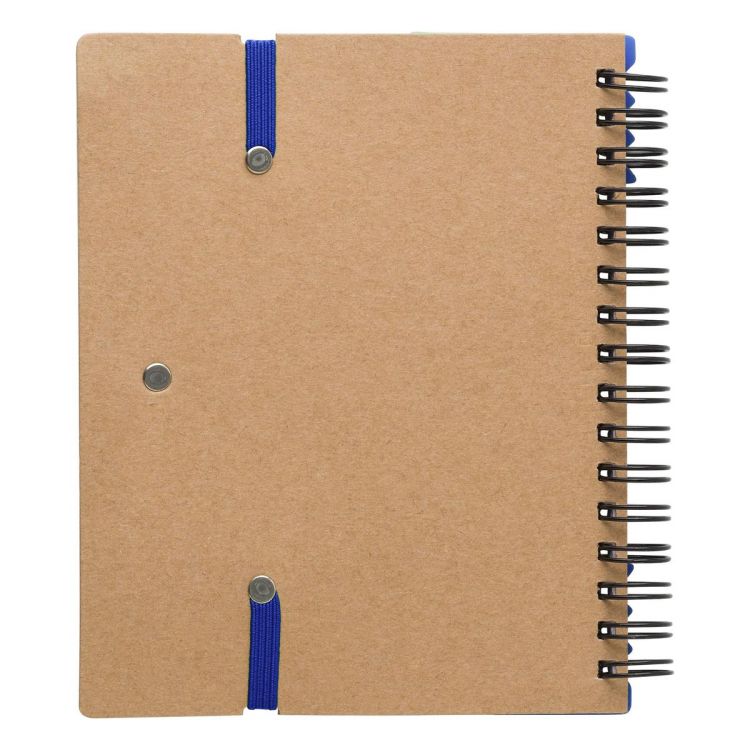 Libreta de papel reciclado, con espiral. Tiene 60 páginas lineadas, notas adhesivas en cinco colores, 25 de cada color, regla y bolígrafo con tinta negra.