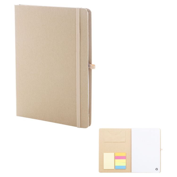 Cuaderno recubierto de cartón reciclado con 70 hojas en blanco de papel reciclado. La cubierta interior incluye 25 notas adhesivas, 125 marcadores de página y un bolsillo para tarjetas. Con correa de goma y soporte para bolígrafos. Tamaño A5, de color natural