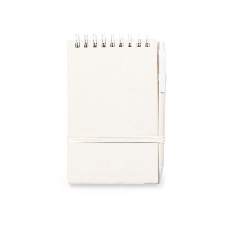 Libreta de tapas duras fabricada a partir de cartones de leche reciclados. Con 80 hojas de disposición a una raya, elástico de sujeción a juego y soporte para bolígrafo. Además, incluye bolígrafo fabricado a juego, con mecanismo pulsador y en tinta azul. Logotipo Recycled Milk Cartón en la esquina de las hojas, contraportada y bolígrafo. Presentada en bolsa individual reciclada.Los cartones de leche se componen en su mayor parte de cartón y aluminio. Durante su proceso de reciclado, se separan los distintos materiales del envase para su reutilización y nuevo uso, contribuyendo así a recorrer el camino infinito de la economía circular. Este material se caracteriza por su alto grado de reciclabilidad, así como por su ligereza y resistencia. (color natural)
