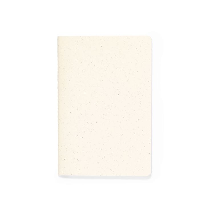 Libreta con tapas fabricadas en cartón reciclado y acabado cosido a juego en el lomo. Interior con 60 hojas blancas lisas. Presentado en bolsa individual reciclada. (color natural)