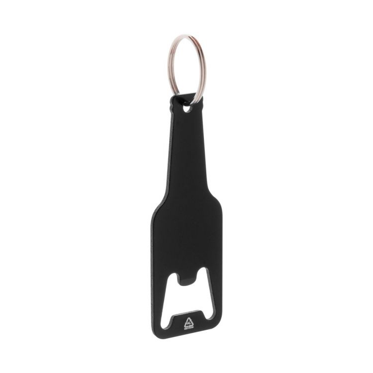 Abrebotellas de aluminio reciclado en forma de botella con llavero metálico.