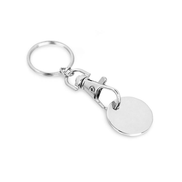 Llavero de metal con forma de moneda. Anilla: ø 25 mm | Producto: ø 23 mm | Conector: 9 mm | Mosquetón: 35 x 16 mm | Total: 80 x 25 x 2 mm. Producto en color plata