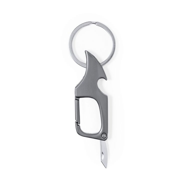 Práctico llavero abridor metálico. Con anilla para llavero y mosquetón para un rápido enganche. Con abrebotellas en uno de sus extremos, incorpora un pequeño cuchillo de acero inox en el extremo opuesto, ideal para abrir cartas, paquetes, etc. En elegante color negro metalizado y presentado en bolsa de papel reciclada. (color plata)