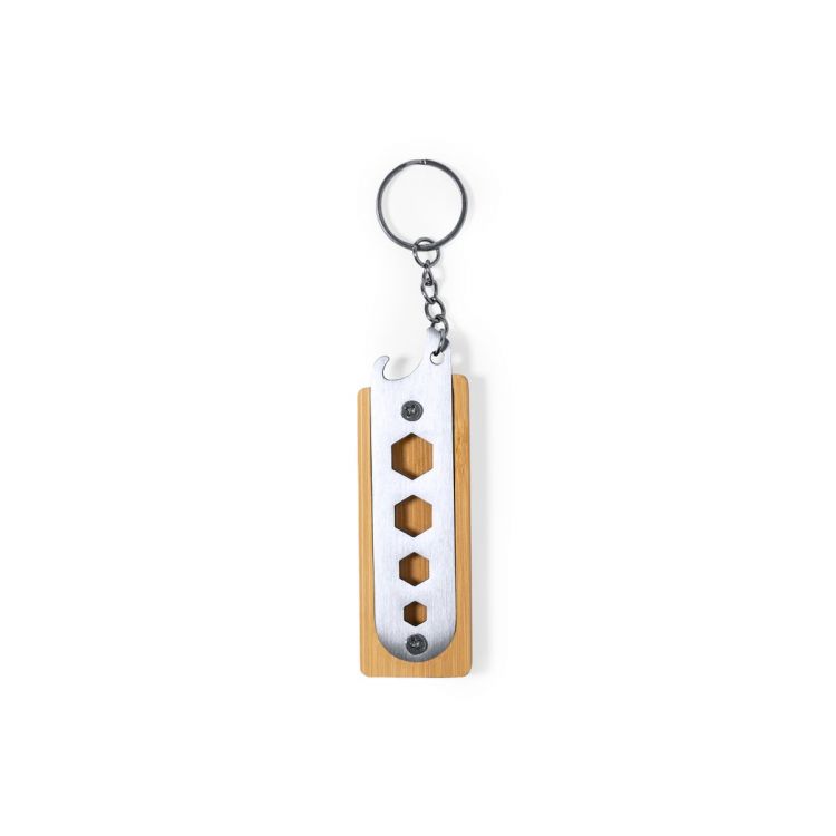 Llavero multiherramienta fabricado en resistente acero inox y bambú. Con práctico conjunto de 4 llaves fijas hexagonales troqueladas y abrebotellas. Presentado en caja individual de diseño kraft. (color natural)
