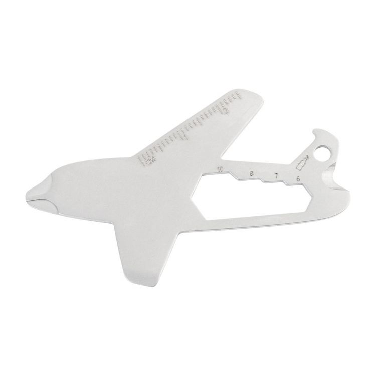 Llavero multiherramienta con forma de avión, fabricado en acero inoxidable reciclado, con abrebotellas, regla, destornilladores estrella y planos, llaves hexagonales y cortaalambres