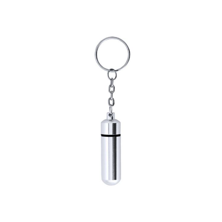 Llavero pastillero de discreto diseño con cuerpo en aluminio de acabado brillante y cierre a rosca. (color natural)