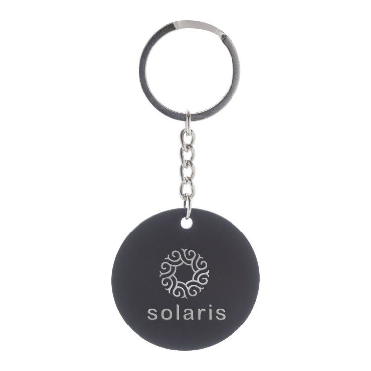Llavero redondo de acero inoxidable reciclado con acabado engomado. Con revestimiento especial para grabado láser en espejo, de color negro