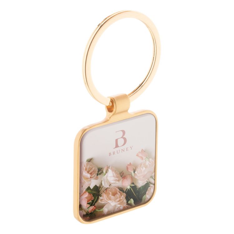 Llavero metálico de forma cuadrada en acabado dorado con placa de bronce de cañón. En caja de papel kraft.