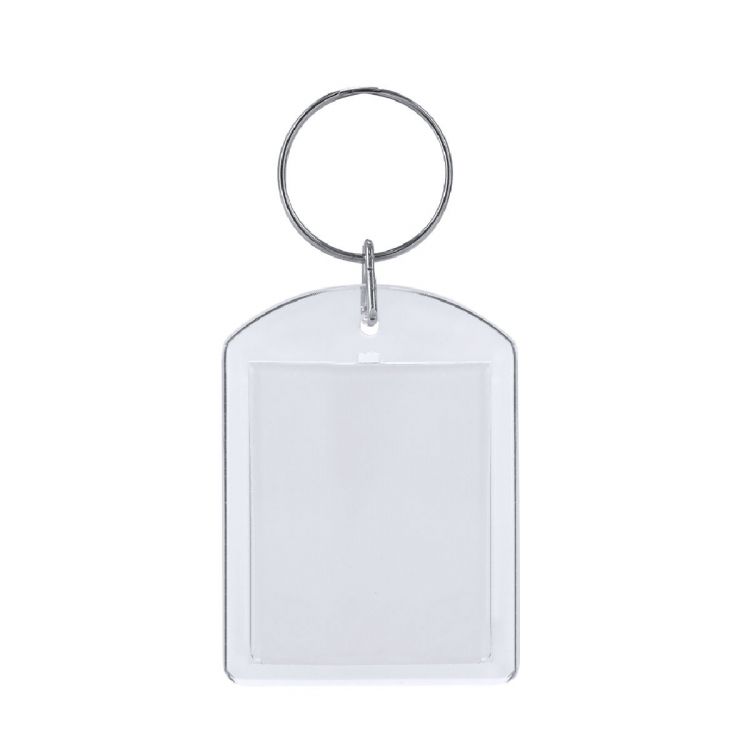 Original llavero transparente con acabado brillante. Dispone de una pequeña ranura que incluye un papel blanco, perfecto para personalizar. Incluye anilla metálica resistente para un uso práctico y duradero. (color blanco transparente)