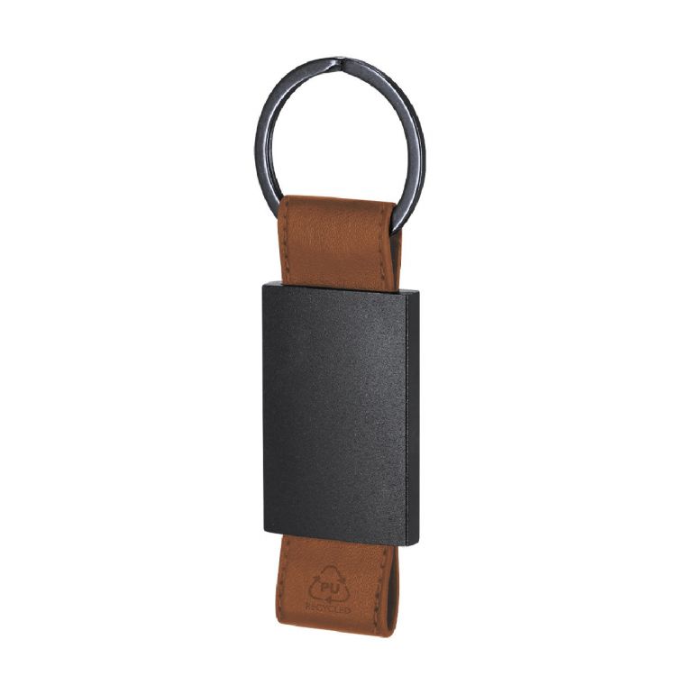Llavero de divertido diseño con cinta de PU reciclado. Con cuerpo negro en acabado mate.