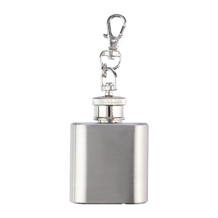 Pequeña petaca de acero inoxidable (s/s304) (30 ml) con llavero mosquetón. Presentada en una caja de cartón marrón.