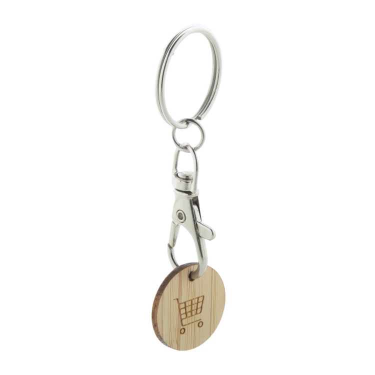 Llavero mosquetón de metal con moneda de carrito de la compra de bambú. Tamaño de la moneda: ø23×2 mm