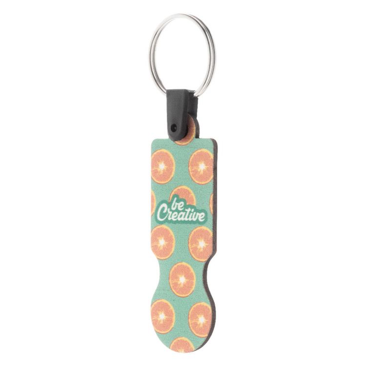 Llavero monedero de madera contrachapada para carrito de la compra con gráficos a todo color. El precio incluye impresión LED UV por una cara. Cantidad mínima: 200 unidades