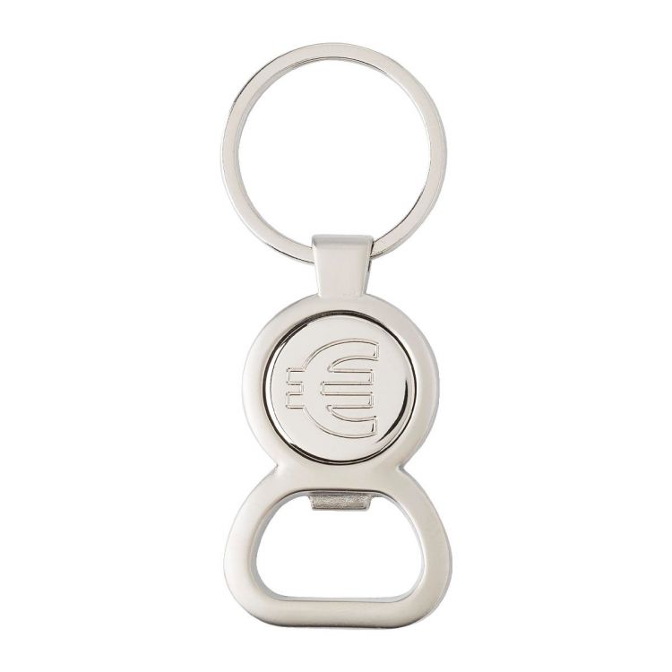 Llavero de metal con abrebotellas y copia de moneda de 0,50€ en el centro. Presentado en caja de regalo.