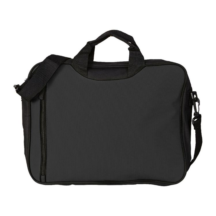 Maletín de poliéster (600 D). Con compartimento principal y bolsillo frontal, ambos con cierre cremallera, asas y bandolera extraíble y ajustable.