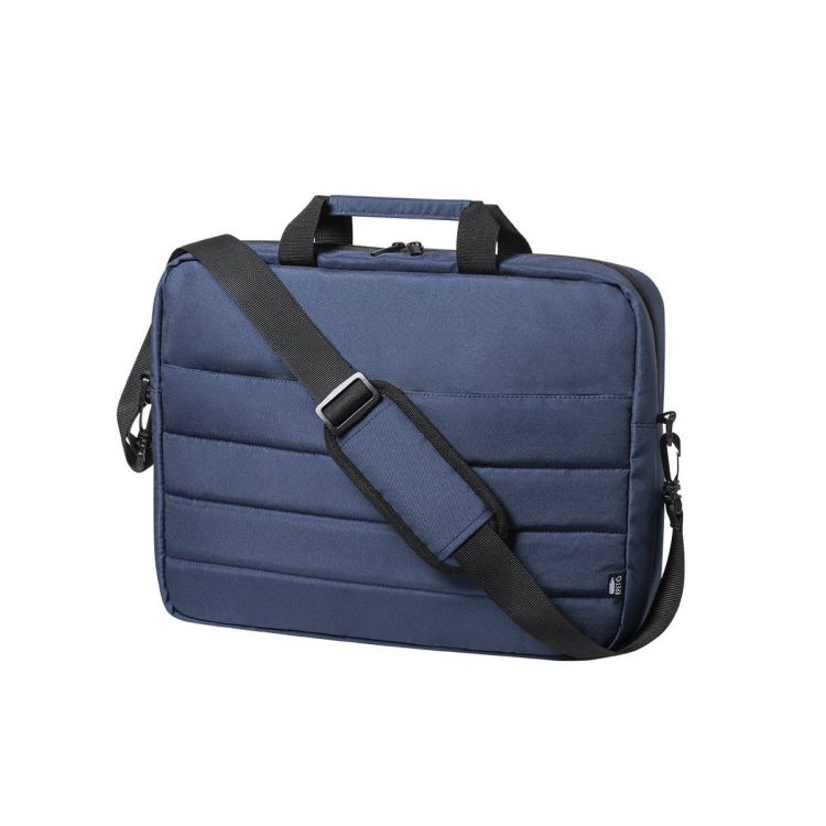 Maletín de línea nature con diseño urbano y acolchado total. Fabricado en resistente RPET 300D elaborado a partir de plástico reciclado, para así fomentar la reutilización de residuos plásticos y contribuir a la sostenibilidad del planeta. Accesorio para ajuste en trolley, con compartimento interior acolchado para ordenador portátil de hasta 15 pulgadas. Bolsillo principal con cierre de cremallera y tirador metálico. Cómodas asas de transporte reforzadas y cinta bandolera ajustable, con refuerzo acolchado para hombro y cierres giratorios de mosquetón. Distintivo RPET en etiqueta.