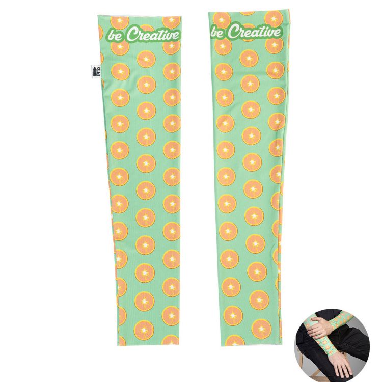 Un par de mangas elásticas RPET hechas a medida con gráficos impresos por sublimación en toda la superficie. 92 % poliéster RPET y 8 % elastano (185 g/m²), con etiqueta RPET. Pedido mínimo: 50 unidades. Tallas: M (8 × 12 × 48 cm), L (9,5 × 13,5 × 52 cm)