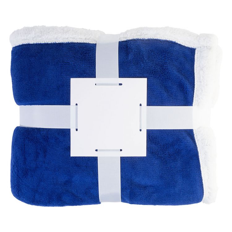 Manta de doble capa con forro polar coral de 200 g/m² y forro polar sherpa reversible de 210 g/m². Envuelta en cinta y tarjeta de papel imprimible.