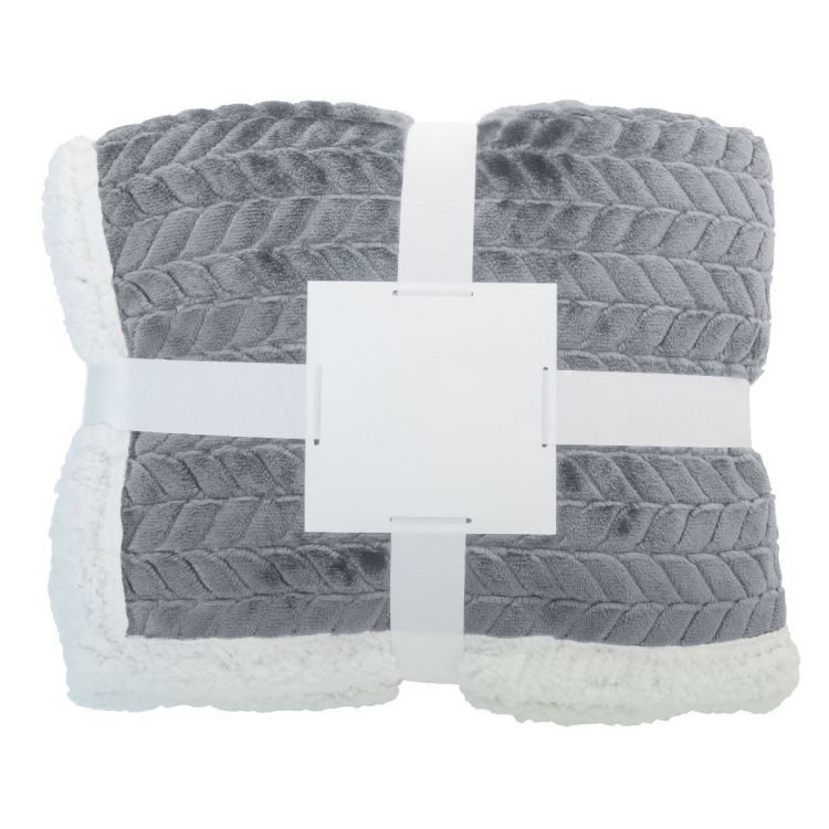Manta RPET de doble capa con estampado jacquard. Con forro de franela RPET de 240 g/m² y forro de sherpa RPET reversible de 210 g/m². Envuelta en cinta y tarjeta de papel imprimible.