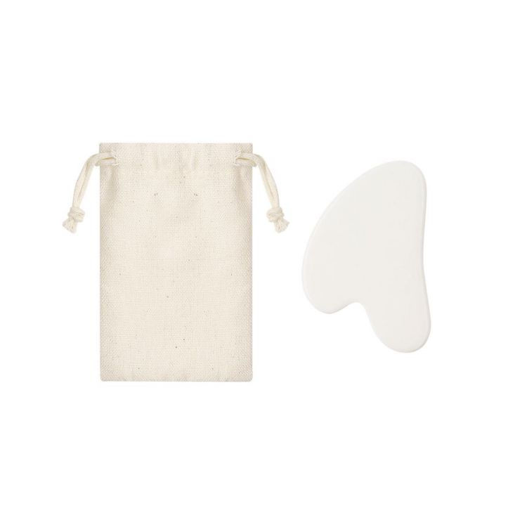 Masajeador facial elaborado en piedra jade blanca. Es ideal para complementar rutinas de cuidado facial. Presentada en bolsa de algodón natural. (color blanco)