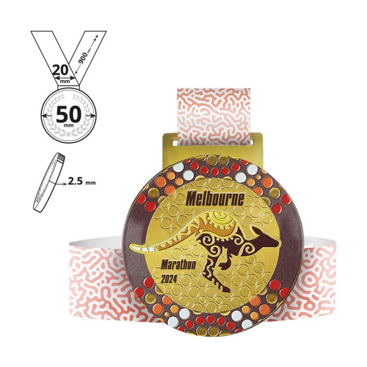 Medalla redonda impresa a todo color en el anverso, que incluye un cordón de 20x900 mm totalmente personalizable. Gracias al procesamiento especial -corte por láser e impresión UV a todo color en toda la superficie- podemos realizar cualquier personalización que solicite el cliente. El reverso de la medalla se tiñe de negro.