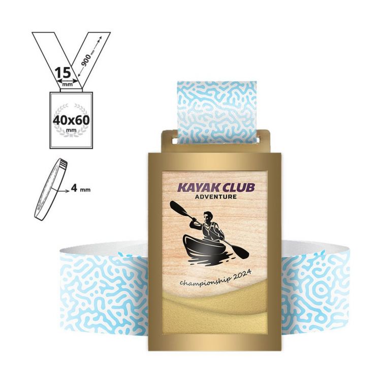 Medalla rectangular fabricada con dos materiales combinados: borde de acero de 8 mm de ancho e interior de madera contrachapada, impresa a todo color en el anverso, e incluye un cordón de 15x900 mm totalmente personalizable. Gracias al corte especial por láser y a la impresión UV a todo color en toda la superficie, podemos realizar cualquier personalización solicitada por el cliente.