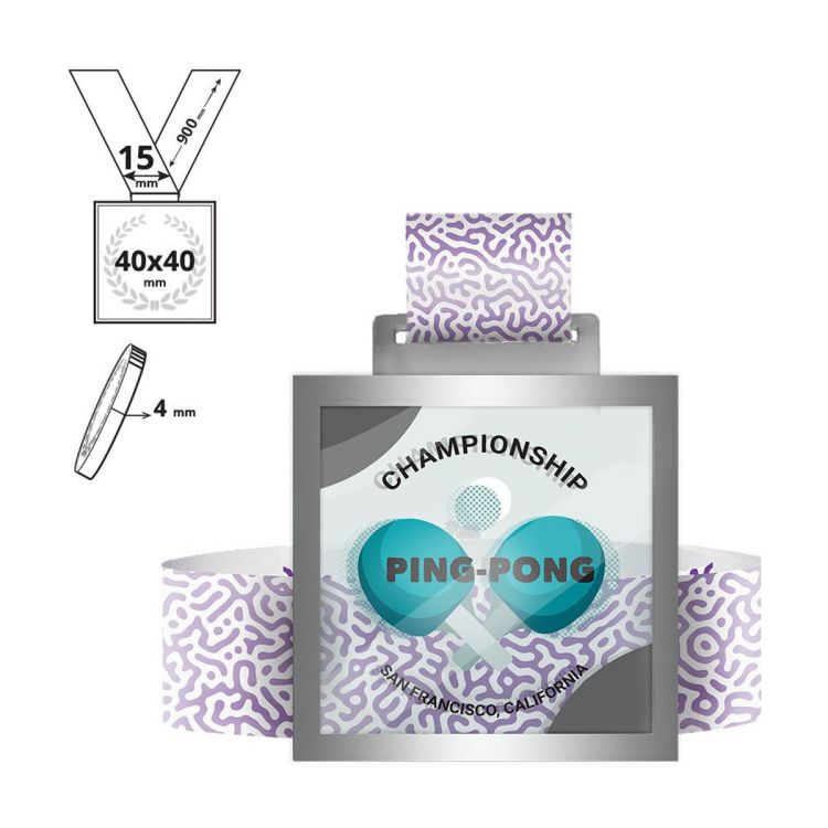 Medalla cuadrada fabricada con dos materiales combinados: borde de acero de 8 mm de ancho e interior de plexiglás, impresa a todo color en el anverso, e incluye un cordón de 15x900 mm totalmente personalizable. Gracias al corte láser especial y a la impresión UV a todo color en toda la superficie, podemos realizar cualquier personalización solicitada por el cliente.