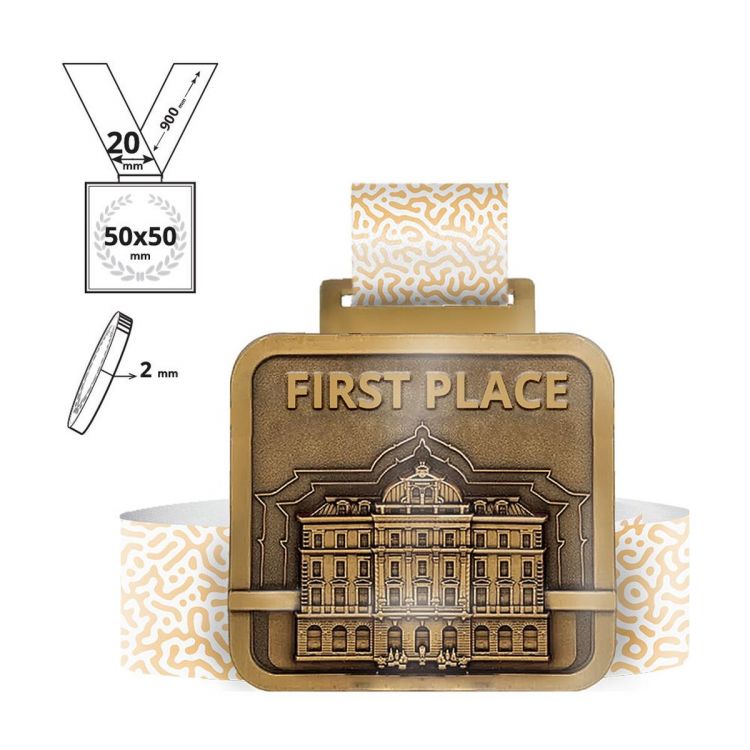 Medalla cuadrada con cordón de 20x900 mm totalmente personalizable incluido. La medalla se fabrica con un molde con efecto 3D creado especialmente según el diseño del cliente. Gracias a esta elaboración podemos obtener un producto único, tridimensional, fundido dentro del molde. Las medallas están disponibles, al mismo precio, en tres acabados diferentes (oro, plata y bronce).