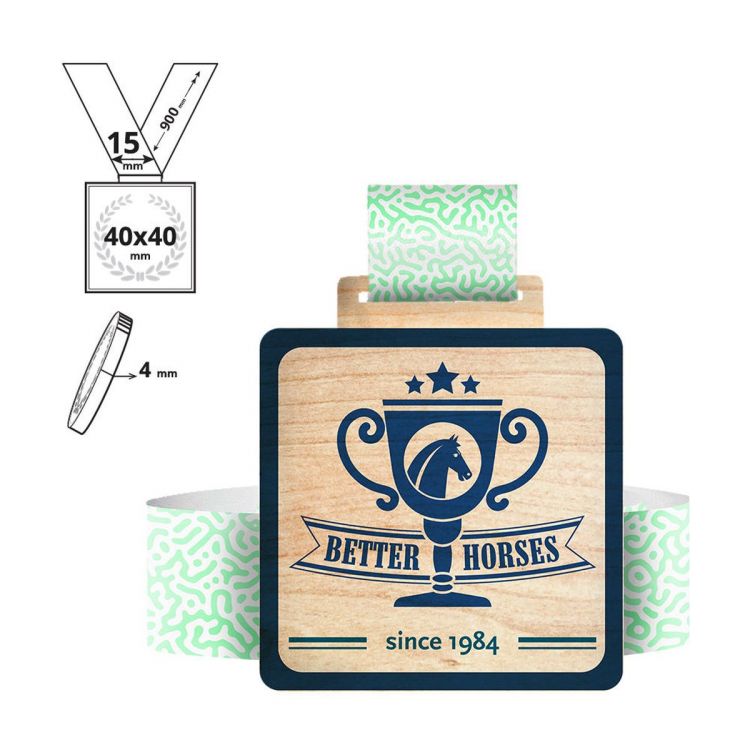Medalla cuadrada impresa a todo color en el anverso, que incluye un cordón de 15x900 mm totalmente personalizable. Gracias al tratamiento especial -corte por láser e impresión UV a todo color en toda la superficie-, podemos realizar cualquier personalización solicitada por el cliente.